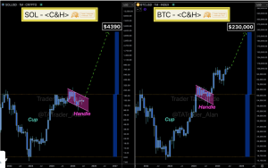 Popular cryptocurrency analyst Trader Alan has identified significant price targets for Bitcoin and Solana based on cup-and-handle chart patterns. Bitcoin could reach $230,000, while Solana targets $4,390 if these technical formations complete successfully.