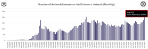 - Ethereum’s main network hit 19.45 million active addresses in August, the highest since 2021.