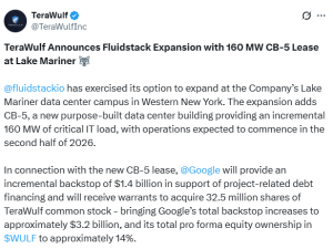 The partnership centers around TeraWulf’s Lake Mariner Campus in Western New York, where the company will provide over 200 megawatts of high-performance computing capacity. Fluidstack exercised an option for another 160 MW with TeraWulf after signing two 10-year computing deals, effectively doubling the AI hosting capacity to 360 megawatts.