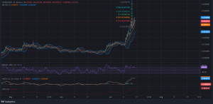 Bollinger Bands indicate that PENGU is trading along the upper band, which is characteristic of parabolic price movements. The Average True Range (ATR) has increased to 0.00221, signaling heightened volatility ahead.