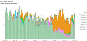 chart tracking token deployment trends and Pump.fun’s dominance in Solana memecoin launches