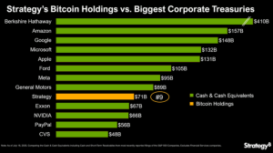 - Strategy broke into the top 10 US corporate treasuries and now ranks 9th with $71 billion in reserves.