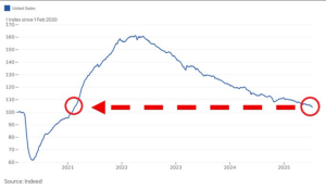 Market insights from The Kobeissi Letter support the case for near-term cuts. The platform reported that job postings on Indeed dropped 8% year-over-year as of July 11, reaching their lowest point since February 2021. The data shows a 65% decline from the March 2022 peak, with job openings only 4% higher than pre-pandemic levels.