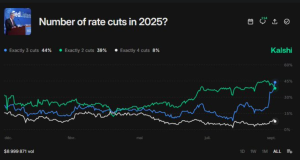 CME FedWatch data indicates the odds of a 50 basis point cut have risen above 10% following the PPI release. Kalshi trading data shows a 44% probability for three rate cuts this year, up from previous expectations of two cuts at 39% probability.