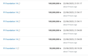 The Pi Foundation executed six major token transfers within 24 hours, moving 550 million PI tokens between August 22-23, 2025. Each transaction ranged from 50 million to 100 million PI, with all transfers originating from verified Pi Foundation wallets. The massive movement has generated widespread speculation among the network’s global community of Pioneers.
