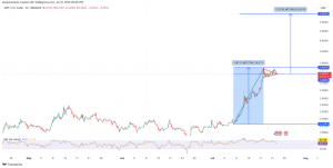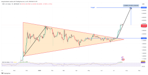 A symmetrical triangle breakout on the daily and a bull flag on the four-hour chart suggest strong momentum behind the current rally.